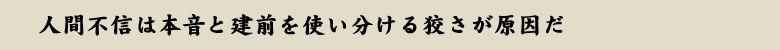 人間はその知恵が行過ぎて、本音を隠して建前でものを言い、その為対人関係は不信にみちその最たるものが、「遊女は客に惚れたと言い、客は来もせず又来ると言う。嘘と嘘との色街で」と歌われた色街と、 皮肉にも国民の期待と信頼を担って国政を司る国会議員の国会でのやりとりだろう。